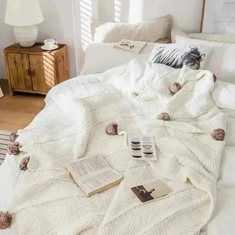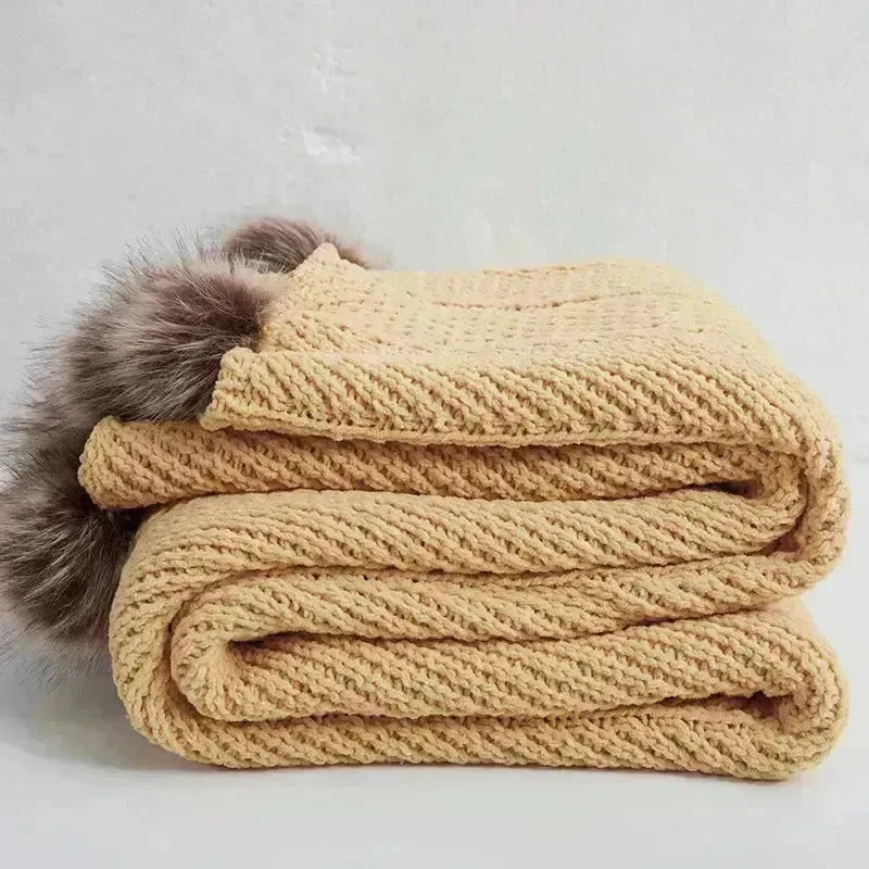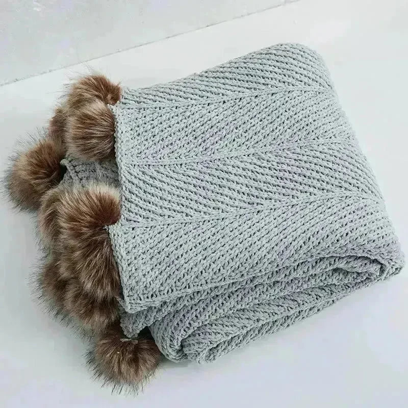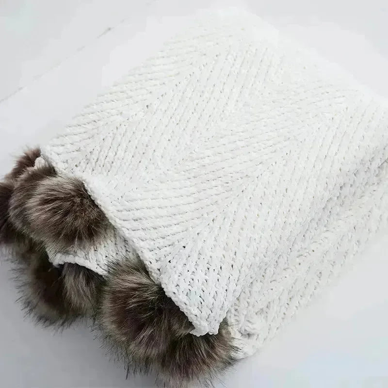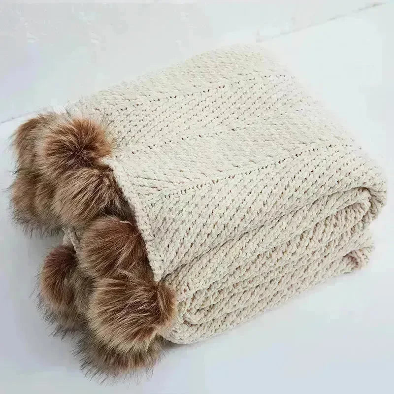 Faux Fur Pompom Cozy Chenille Throw Blanket
