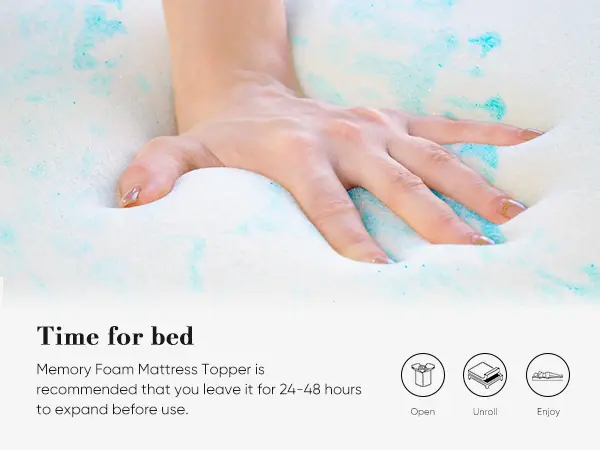 • The cooling mattress boasts remarkable elasticity and resists deformation effectively. Installing our mattress topper is effortless. The memory foam topper is compressed and packed for easy transportation. So please put it in a ventilated place for 24 hours and let it return to its original size.In addition, please do not leave the sponge in the sun, it will turn yellow.